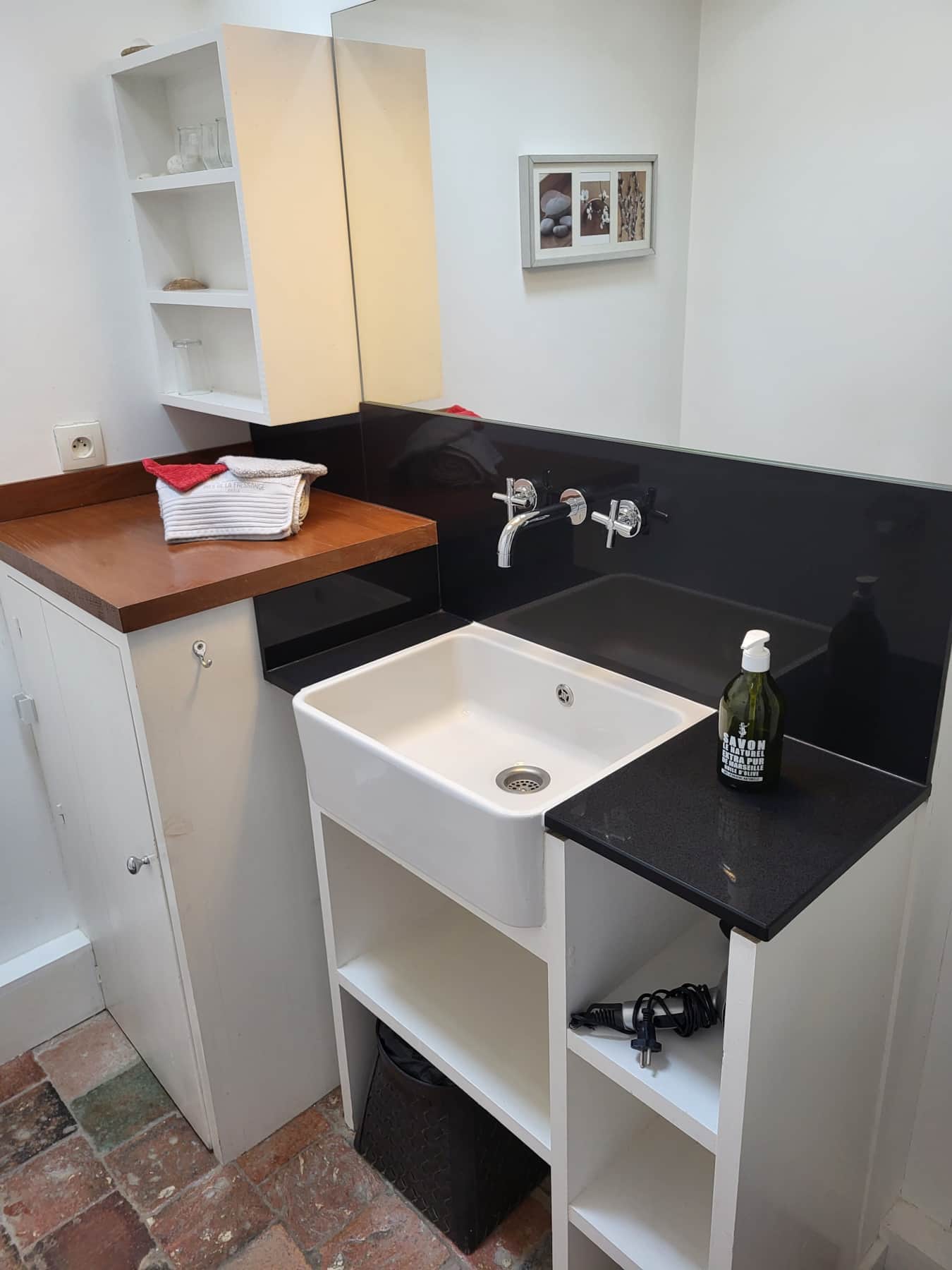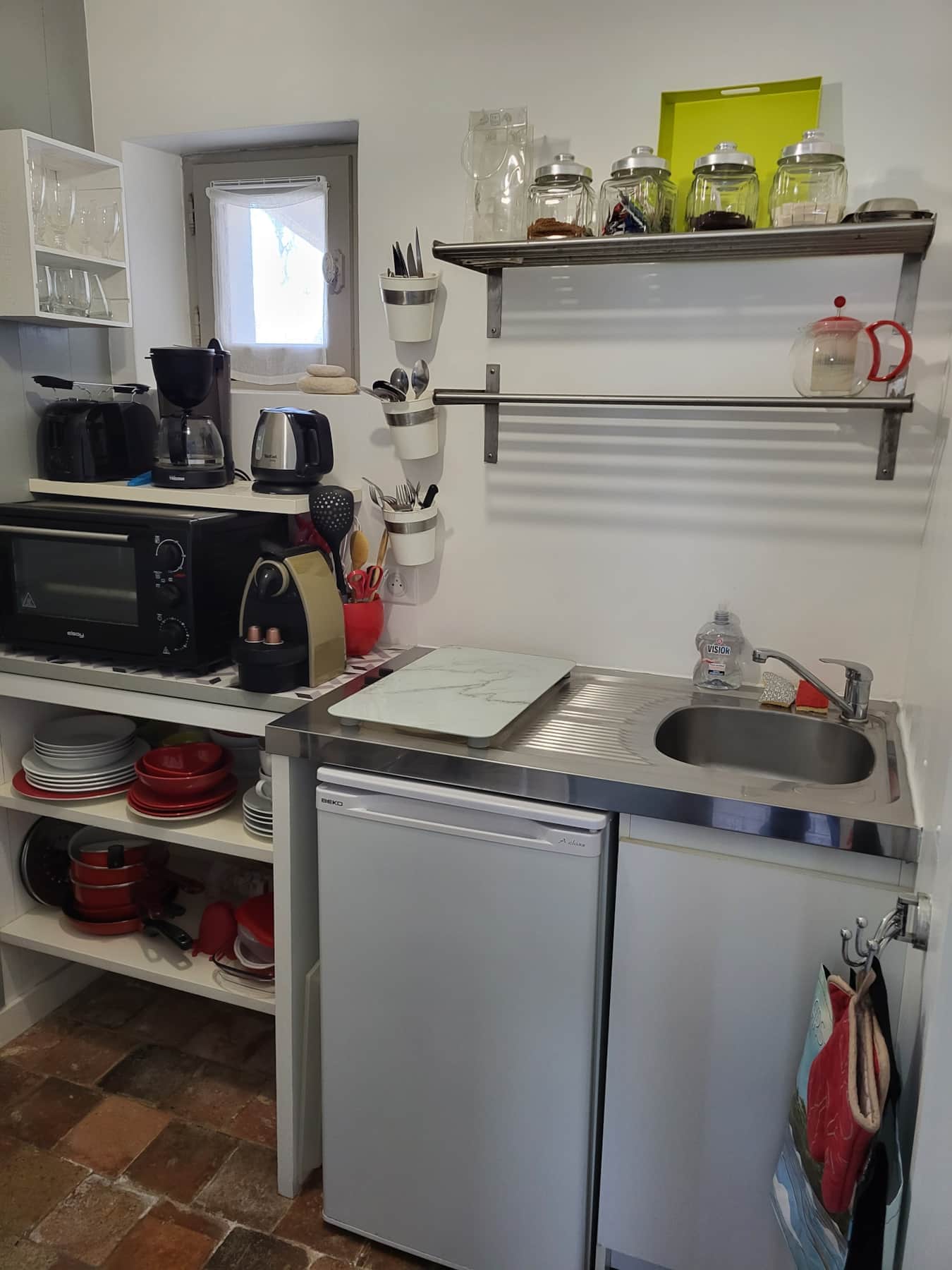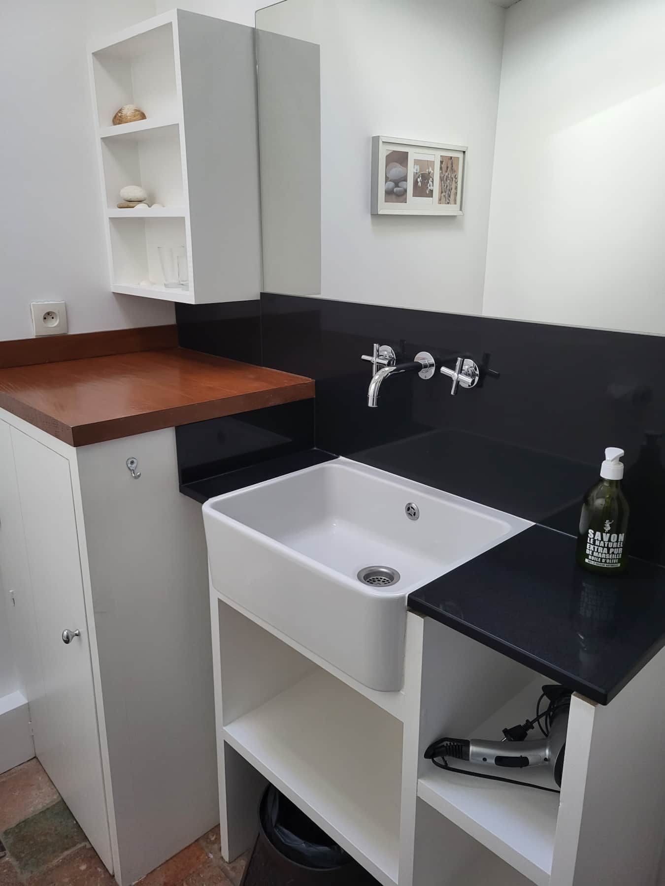 Le studio dispose d’une kitchenette séparée et fonctionnelle, pensée pour rendre votre séjour pratique et agréable. Vous y trouverez des plaques chauffantes, un réfrigérateur, un petit four, un grille-pain, une bouilloire, une machine à café ainsi qu’une machine expresso — tout le nécessaire pour préparer vos petits-déjeuners, déjeuners légers ou dîners en toute simplicité.